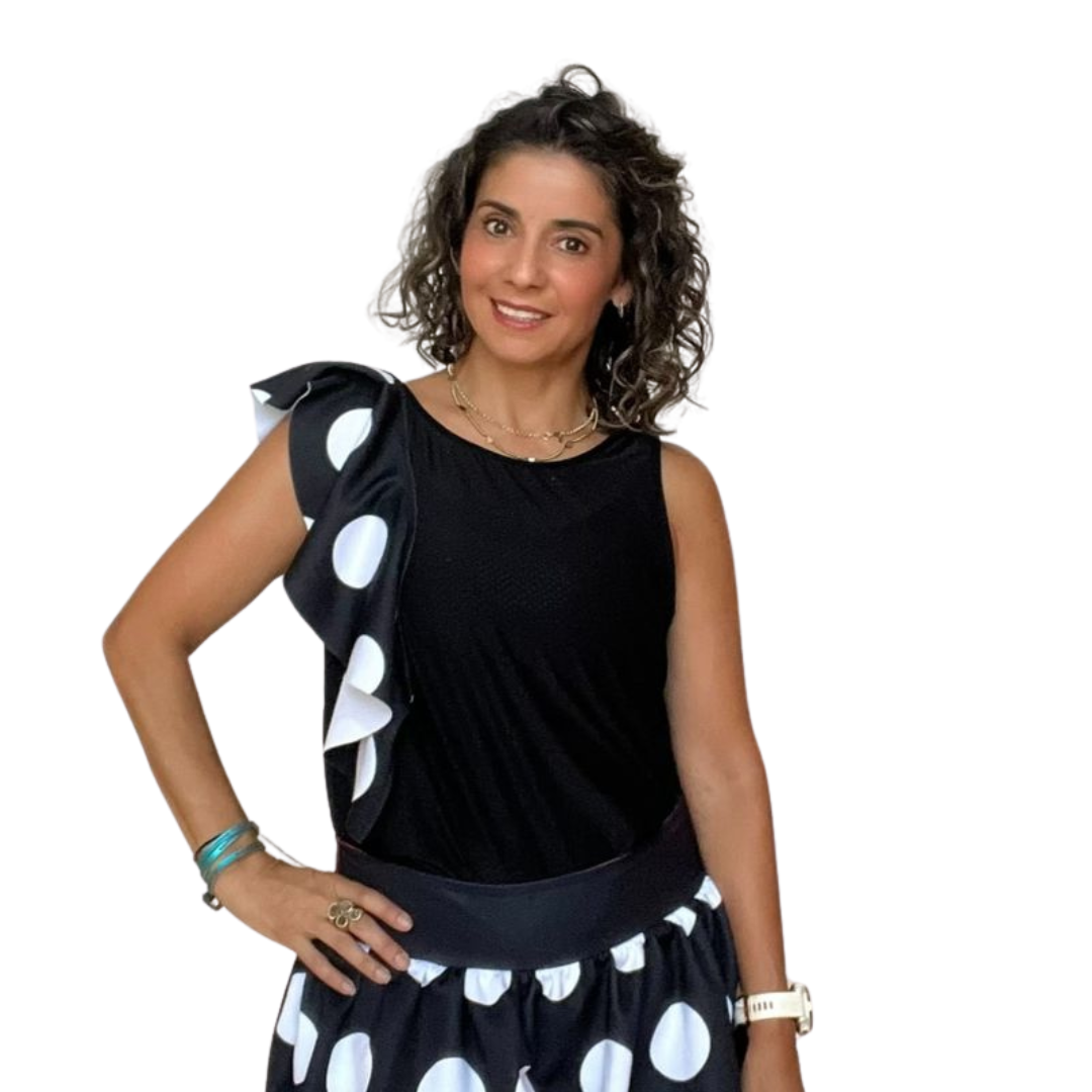 Asymmetry done right. A breathable performance tank with a single polka-ruffle shoulder that brings playful drama without sacrificing speed.